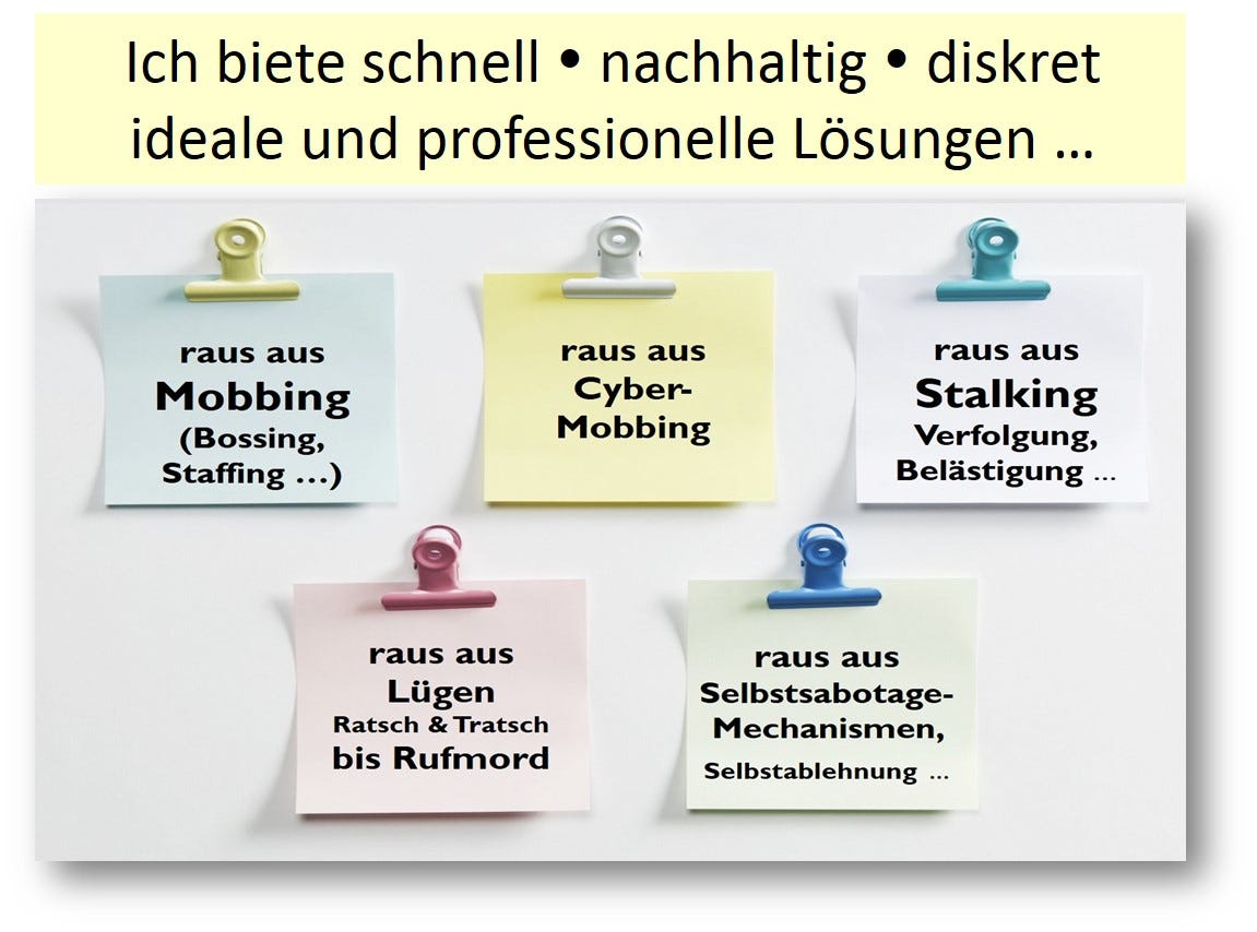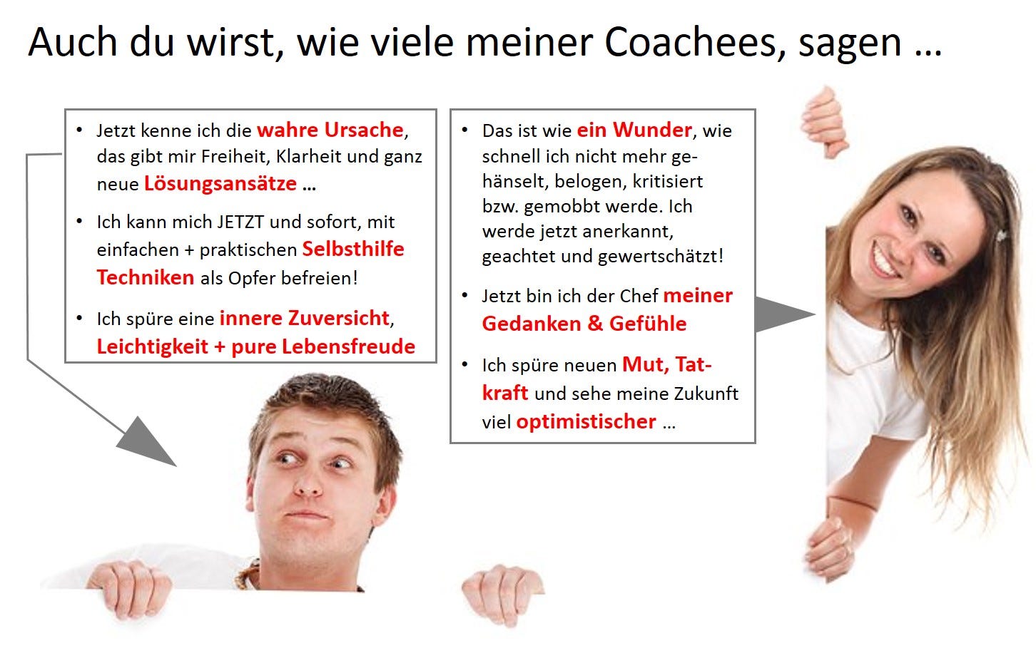 Mit meinem Mobbing & Co. Selbstschutz-Coaching können wir gemeinsam deine fremdgesteuerten Mobbing-Mechanismen durchbrechen, dass auch du endlich dein Leben frei und selbstbestimmt gestalten kannst.